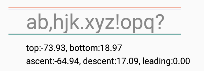 canvas.drawText(String.format(Locale.CHINA, "ascent:%.2f, descent:%.2f, leading:%.2f", fm.ascent, fm.descent, fm.leading), x, y + notePaint.getTextSize() * 4f, notePaint);